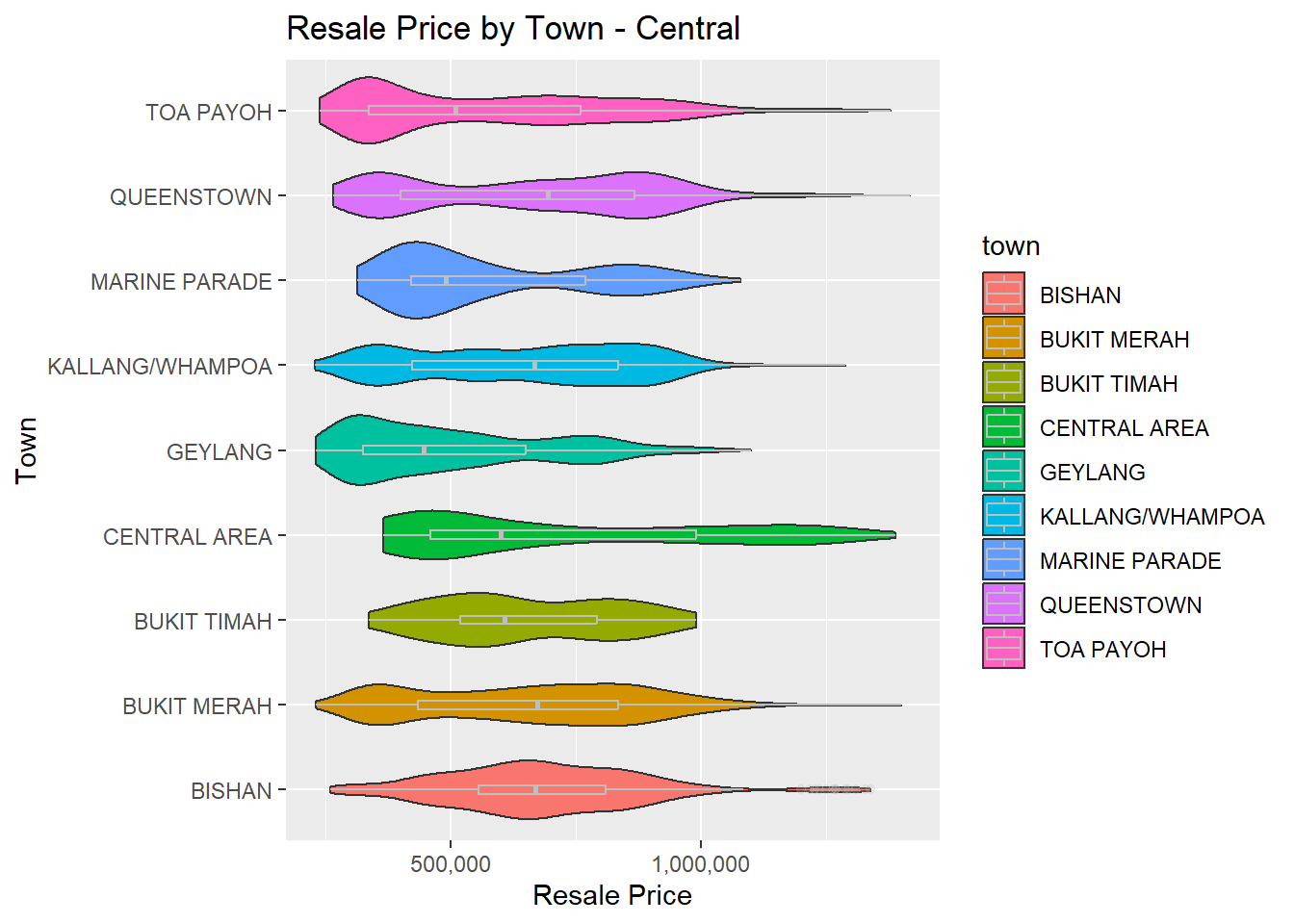 Bukit Timah and Bukit Mera have less curvy shape in their violins. It may indicate that their price is relatively stable than the other towns.