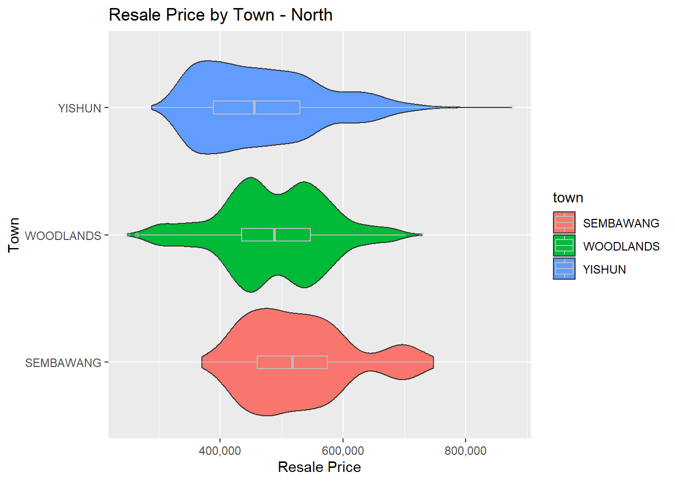 Based on previous findings, we can tell these two regions - Central and North - are at the most extreme end in terms of well-selling flat types as well as price range. Therefore, we will look into these regions using violin plot. Violin plot can be created by using geom_violin(). You may overlay boxplots to each violin plots using geom_boxplot(). To make the visualization look less crowded, you may set the color of boxplot in monochrome by setting the color attribute as grey.